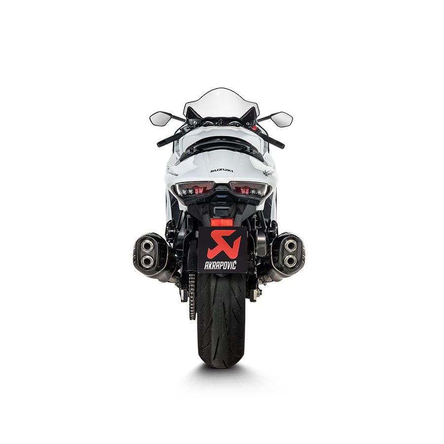 Her birinde Euro 5 EC/ECE tip onayına tamamen uygun katalitik konvertör bulunan iki yenilikçi ve aerodinamik susturucu, motosikletin tasarımına mükemmel uyum sağlar. Susturucular üzerindeki siyah kaplamalı hafif titanyum dış manşon ve yüksek kaliteli paslanmaz çelik bağlantı borularının yanı sıra karbon fiber uç kapakları ve karbon fiber ısı kalkanlarından üretilen egzoz , standarttan %31,6 daha hafiftir. Lazerle işlenmiş Akrapovič logosuna sahip bu sistem, sürücüye motosikletin motorunu ve performansını hissettirmek için harika bir gaz tepkisine sahiptir ve aynı zamanda 8.700 dev/dk'da 1,2 kW (1,6 hp) ve 8.400 dev/dk'da 1,9 Nm tork ekler. Canlı, sportif ve derin bir müzik, egzoz gazına başka bir boyut katıyor ve duyuları daha da heyecanlandırıyor. Yeniden eşleme gerektirmeyen, basit bir tak ve çalıştır ürünüdür.
